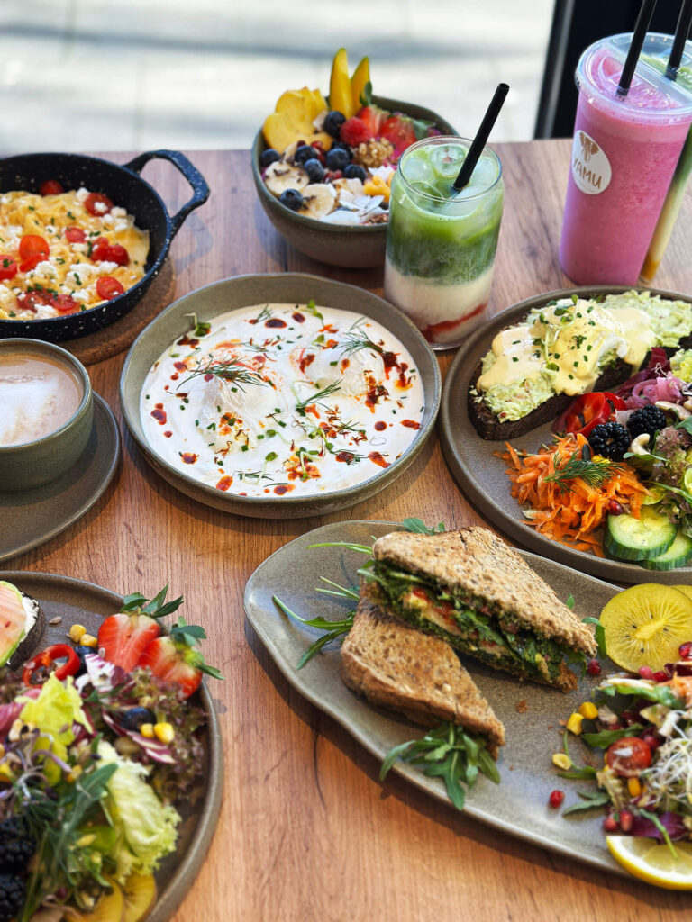 Dazu kommen täglich frisch gebackene Kuchen und Desserts, die für süße Momente sorgen und regelmäßig wechseln. Ob ein schneller Kaffee am Vormittag oder ein ausgedehntes Brunch-Date mit Freunden – das Café Yamu steht für Genuss, Leichtigkeit und echtes Wohlfühlen.